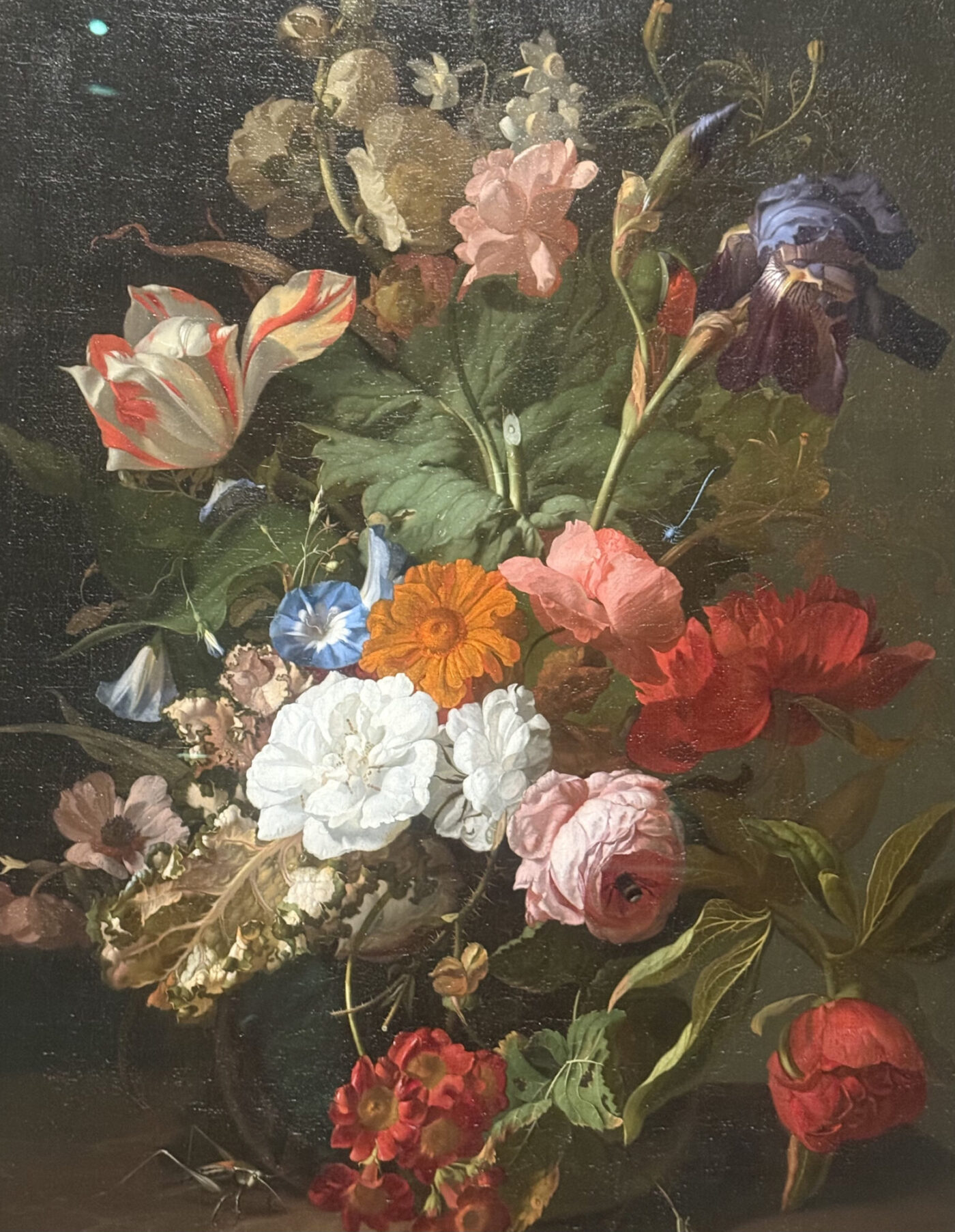 Rachel Ruysch: (Dutch) “Still Life of Exotic Flowers on a Marble Ledge” 1735 Oil on canvas. Contrasts 36 flowers from around the world with symbols of decay